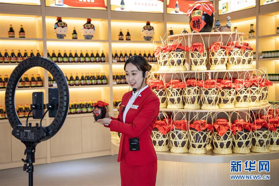 4月20日,在中国镇江醋文化博物馆,工作人员通过直播平台向观众介绍醋产品。新华社发(封疆江 摄)