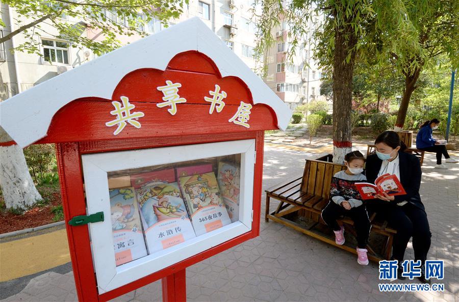 4月22日,在河北省邯郸市复兴区石化社区广场,居民在“流动共享书屋”旁阅览图书。 4月23日是“世界读书日”。 新华社发(郝群英 摄)