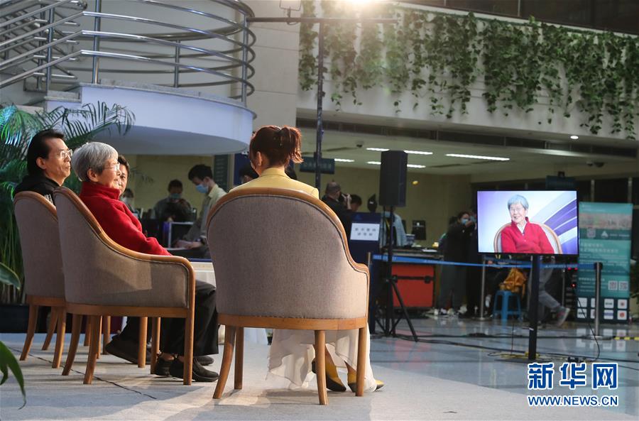 4月23日,敦煌研究院名誉院长樊锦诗(右二)参与“大阅读时代,如何寻找阅读之美”主题对话。 当日是世界读书日,上海图书馆通过网络平台直播“上图之夜——阅读点亮城市”活动,受邀嘉宾通过网络与广大读者话读书,开启一场别开生面的云上交流。 新华社记者 方喆 摄
