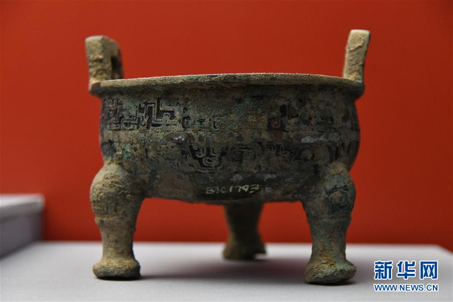 这是展出的青铜鼎(4月24日摄)。 山东博物馆年度特展“六合同风——秦文化大展”即将展出,目前工作人员正在紧张布展中。本次展览除展出秦始皇兵马俑实物外,还集合了全国25家文博单位的140多件组精品文物,为参观者献上一场文化盛宴。 新华社记者 朱峥 摄