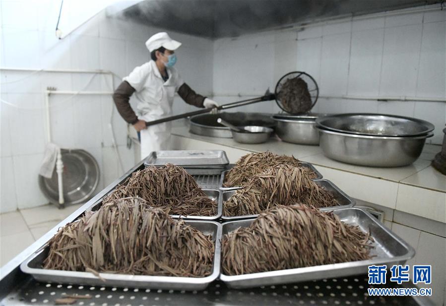 4月27日,在石家庄市正定县胜两河食品有限公司,工人在炒制崩肝。 “崩肝”是河北古城正定的特色名吃,传承历史悠久。正定崩肝选取优质黄牛肝为原料,经过蒸煮、切丝、炒辅料、崩炒等十几道工序制作而成。2011年,正定崩肝被列入石家庄市第四批非物质文化遗产名录。 新华社发(陈其保 摄)