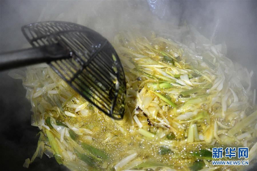 4月27日,在石家庄市正定县胜两河食品有限公司,工人在炒制崩肝调料。 “崩肝”是河北古城正定的特色名吃,传承历史悠久。正定崩肝选取优质黄牛肝为原料,经过蒸煮、切丝、炒辅料、崩炒等十几道工序制作而成。2011年,正定崩肝被列入石家庄市第四批非物质文化遗产名录。 新华社发(陈其保 摄)