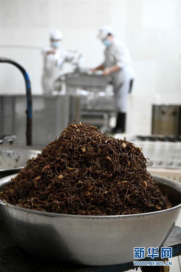 4月27日,在石家庄市正定县胜两河食品有限公司,工人在包装崩肝。 “崩肝”是河北古城正定的特色名吃,传承历史悠久。正定崩肝选取优质黄牛肝为原料,经过蒸煮、切丝、炒辅料、崩炒等十几道工序制作而成。2011年,正定崩肝被列入石家庄市第四批非物质文化遗产名录。 新华社发(陈其保 摄)