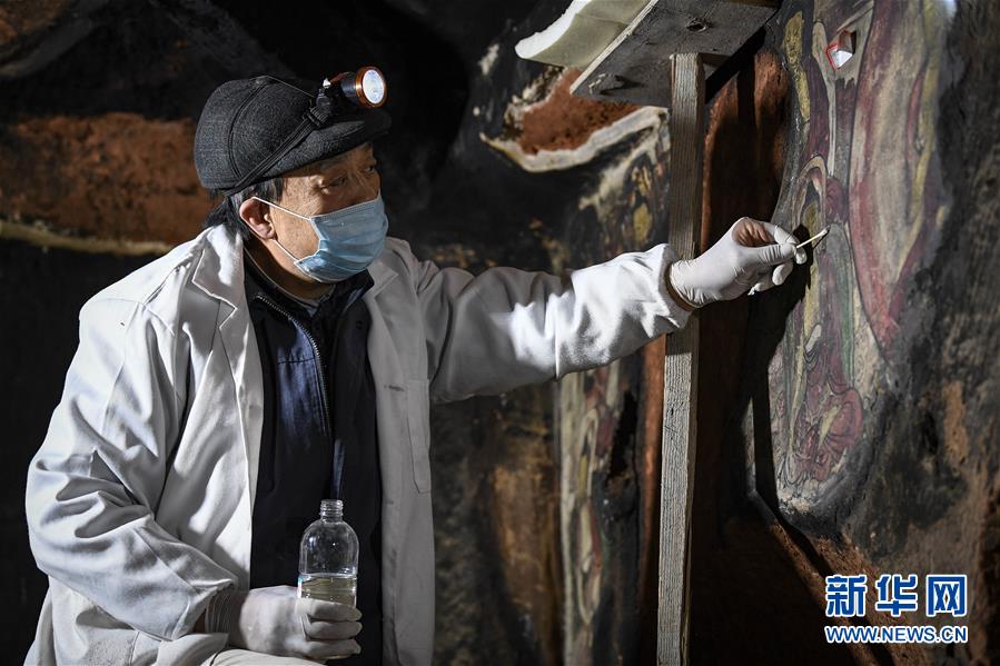 4月27日,文物修复专家在宁夏须弥山石窟圆光寺48号窟内修复壁画。新华社记者 冯开华 摄