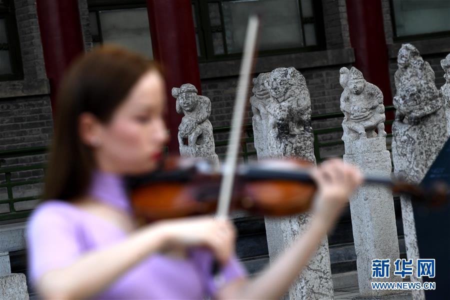 4月28日,在西安碑林博物馆,西安交响乐团小提琴首席伍思雨在“云上国宝”音乐会彩排前练习。 当日,西安交响乐团的乐手来到西安碑林博物馆,为将于5月2日举行的“云上国宝”音乐会进行彩排。“云上国宝”音乐会将通过网络直播的形式向观众融合展示古典音乐和国之瑰宝,开启音乐与国宝的“对话”。 新华社记者 李一博 摄