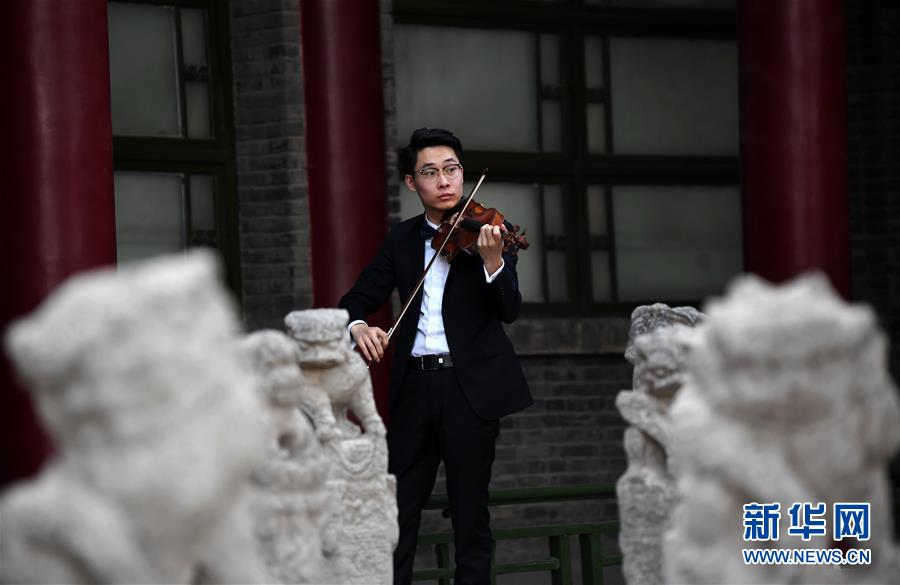 4月28日,在西安碑林博物馆,西安交响乐团小提琴首席周虎翼在“云上国宝”音乐会彩排前练习。 当日,西安交响乐团的乐手来到西安碑林博物馆,为将于5月2日举行的“云上国宝”音乐会进行彩排。“云上国宝”音乐会将通过网络直播的形式向观众融合展示古典音乐和国之瑰宝,开启音乐与国宝的“对话”。 新华社记者 李一博 摄