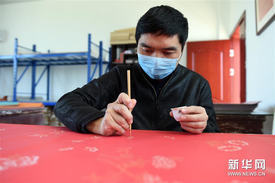 4月28日,在安徽省巢湖市黄麓镇掇英轩书画用品有限公司,刘靖在制作手绘“粉蜡笺”。新华社发(周牧 摄)