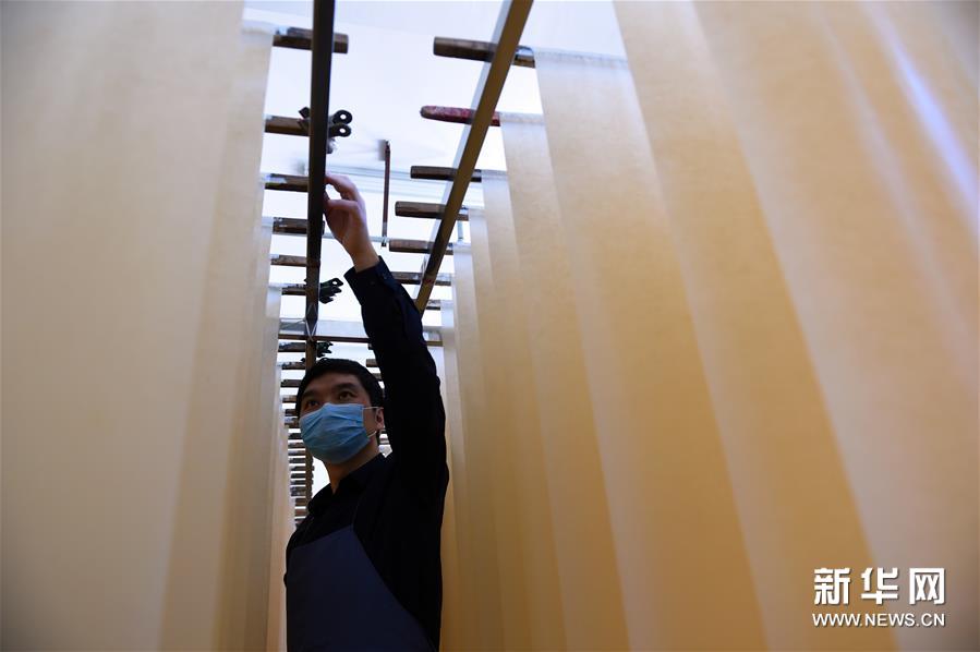 4月28日,在安徽省巢湖市黄麓镇掇英轩书画用品有限公司,刘靖在进行纸笺加工的提挂工序。新华社发(周牧 摄)