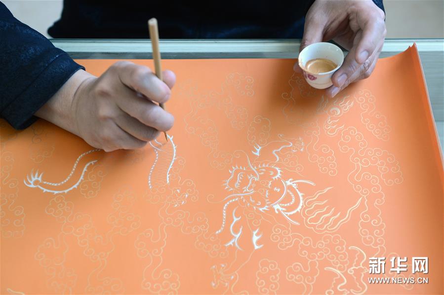 4月28日,在安徽省巢湖市黄麓镇掇英轩书画用品有限公司,刘靖在制作手绘“粉蜡笺”。新华社记者 韩晓雨 摄