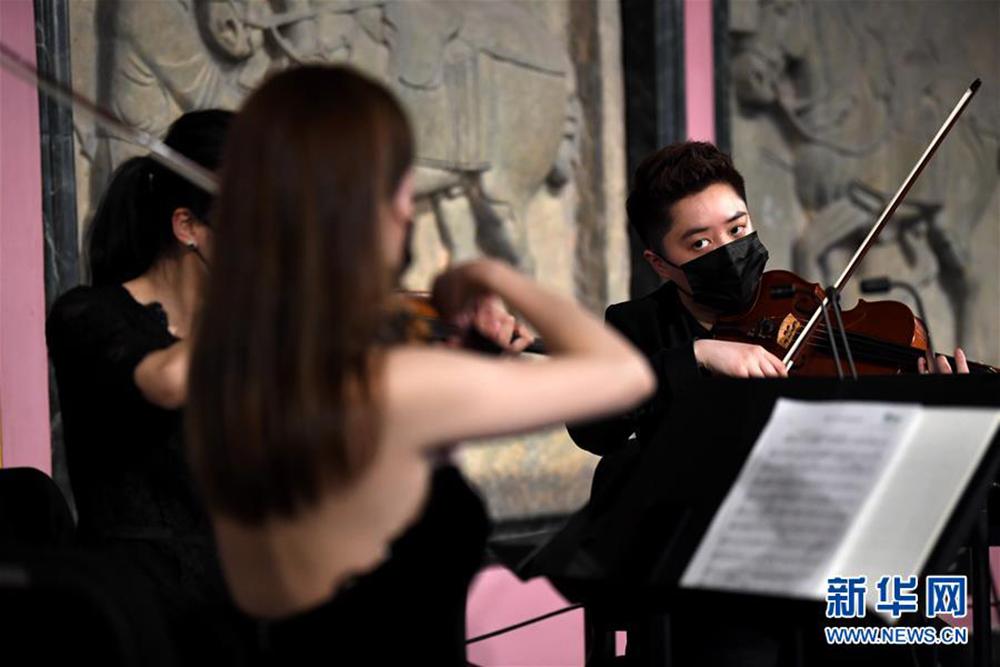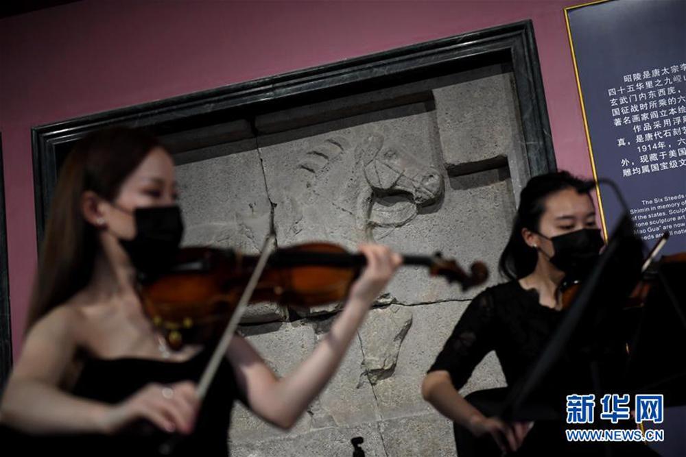 在西安碑林博物馆昭陵六骏石刻前,西安交响乐团“弦上莫奈四重奏”为“云上国宝”音乐会彩排(4月28日摄)。