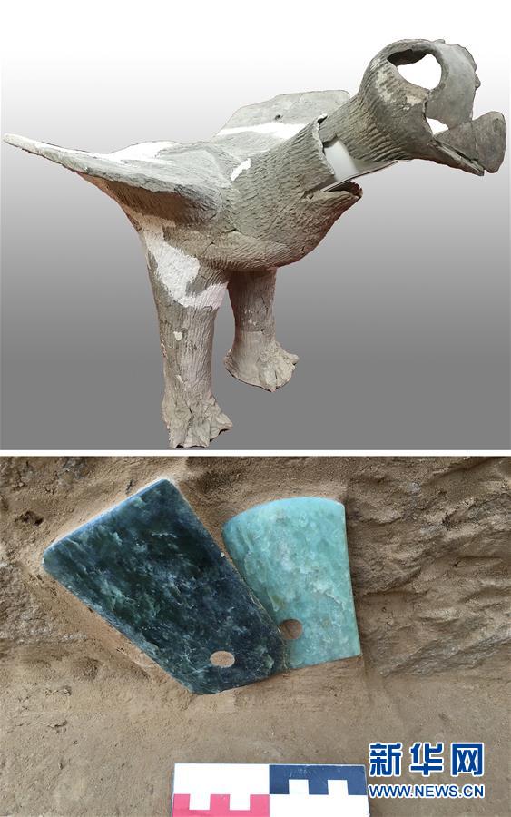 陕西神木石峁遗址皇城台出土的陶鹰(上图)和玉钺(下图)(拼板资料照片)。新华社发(中国文物报社供图)