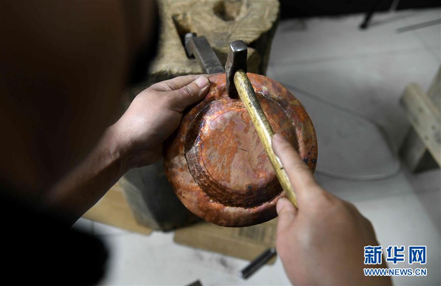 5月6日,在河北石家庄市新华区燕赵文化艺术市场工作室,民间艺人王建辉在进行金工冷锻造手工技艺创作。