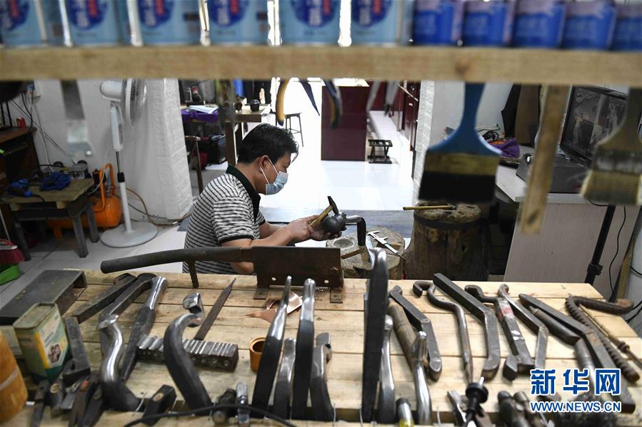 5月6日,在河北石家庄市新华区燕赵文化艺术市场工作室,民间艺人王建辉在进行金工冷锻造手工技艺创作。新华社发(陈其保 摄)
