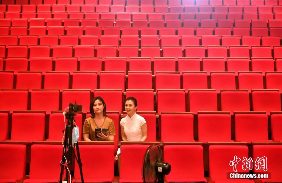 5月6日晚,福建福州,福建芳华越剧院的演员们在福建大剧院音乐厅,通过“云中剧院”表演经典越剧折子戏,让观众足不出户,通过线上直播欣赏到精彩的演出。图为主播在线介绍演出流程。中新社记者 吕明 摄