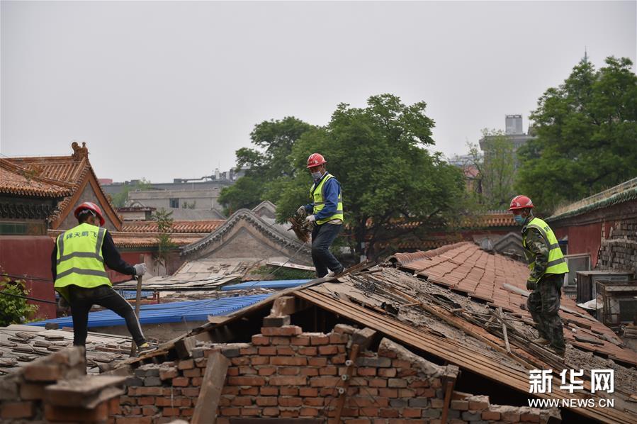 5月7日,工人在皇史宬南院内的屋顶上拆违。新华社发(陈钟昊摄)