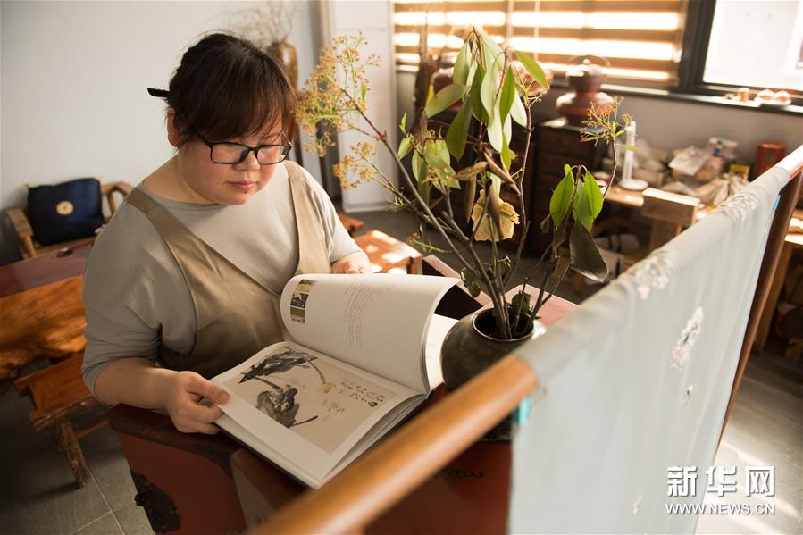 5月6日,严少英在工作室翻看古代名家的绘画作品,为创作寻找灵感。 新华社记者 翁忻旸 摄