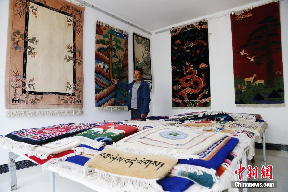 5月8日,在青海省湟中县加牙村加牙藏族织毯技艺传习所内,加牙藏毯第七代传人杨永良展示制作精美的藏毯。杨永良介绍,加牙村有着300多年的织毯历史,加牙藏毯色泽艳丽不褪色,质地坚硬而富有弹性,可以使用近200年。独特的编制技法及浓郁的民族特色使加牙藏毯受到众多国内外藏毯爱好者的喜爱。中新社记者 马铭言 摄