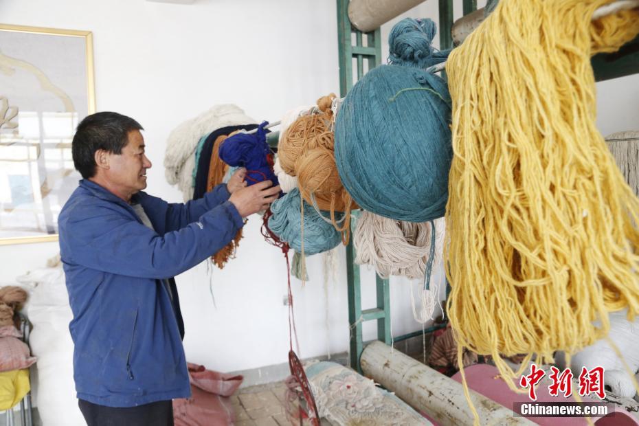 在青海省湟中县加牙村加牙藏族织毯技艺传习所内,青海加牙藏毯第七代传人杨永良在织房内整理已染好色的羊毛线。中新社记者 马铭言 摄