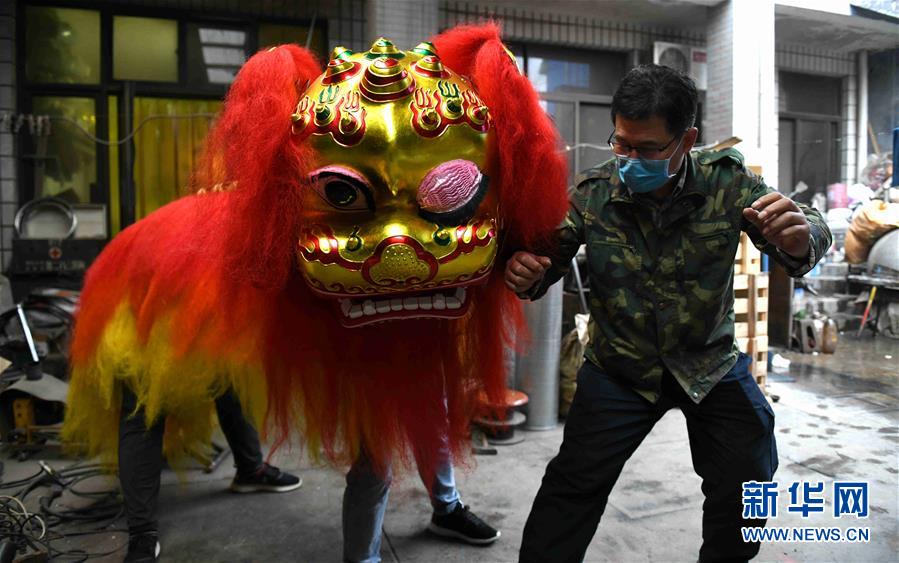 5月7日,正定龙狮道具制作技艺传承人马小增(右)在位于河北省正定县的工作室,在工作人员的帮助下展示他制作的龙狮道具成品。 正定龙狮道具制作技艺是一门传统手艺,入选河北省非物质文化遗产名录。正定龙狮道具有造型活泼、威武雄壮、色彩艳丽等特点,制作技艺包括制作狮头、狮皮以及配套的彩画、装饰、组装等多道工序。 新华社发(陈其保 摄)