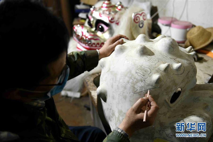 5月7日,正定龙狮道具制作技艺传承人马小增在位于河北省正定县的工作室绘制龙狮道具图案。 新华社发(陈其保 摄)
