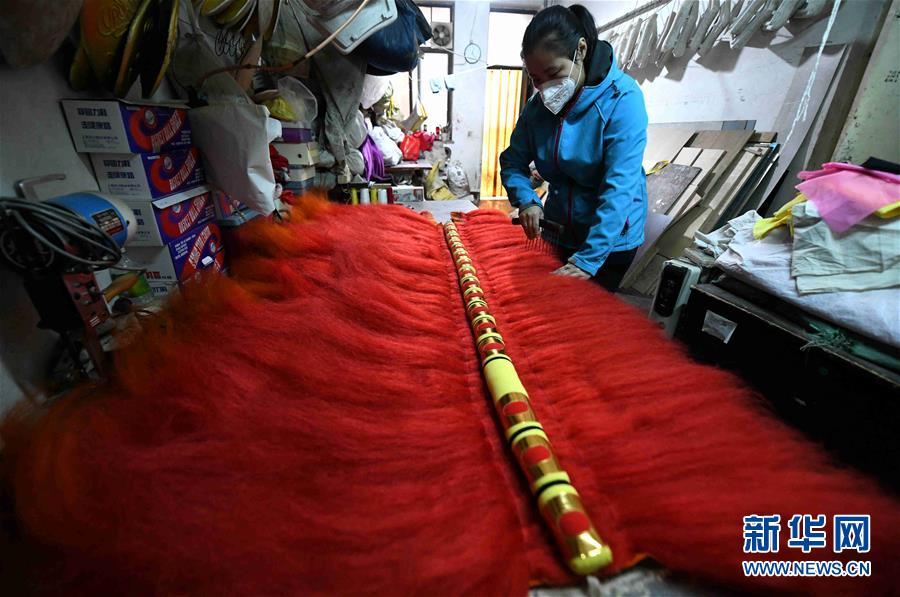5月7日,在河北正定龙狮道具制作技艺传承人马小增的工作室,工作人员在梳理龙狮道具的“皮毛”。 新华社发(陈其保 摄)