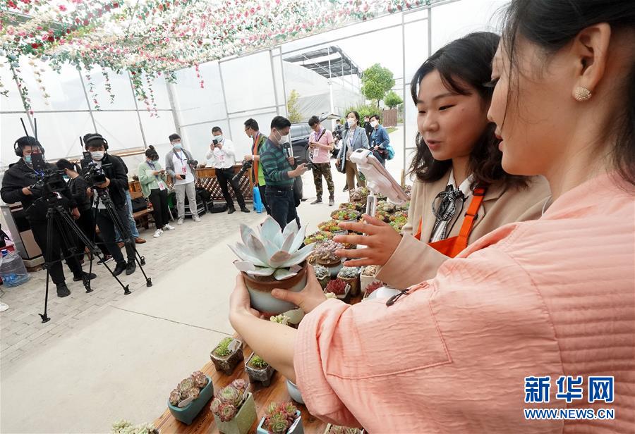 5月8日,工作人员在花艺展现场进行花卉“网购直播”。 当日,以“花卉月浦 绽放幸福”为主题的2020上海宝山区月浦镇花艺展拉开帷幕,本届花艺展采用“线下体验、线上观摩”的展销新模式,100多种花卉植物、3万余盆主题花卉通过乡村直播平台走进千家万户。 新华社记者 陈飞 摄
