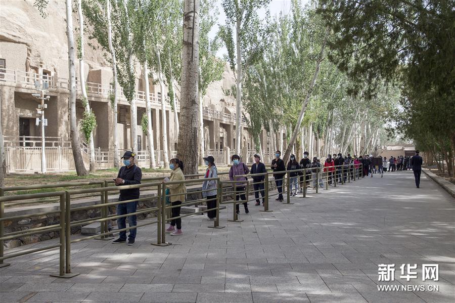 2020年5月10日起,因疫情防控关闭百余天的敦煌莫高窟恢复开放。目前,莫高窟每天限售门票1800张,为最大承载量的30%,且暂不接受旅行社团队预约。恢复开放仅限实体洞窟,数字展示中心、敦煌藏经洞陈列馆等场馆暂不开放。 新华社发(孙志军 摄)