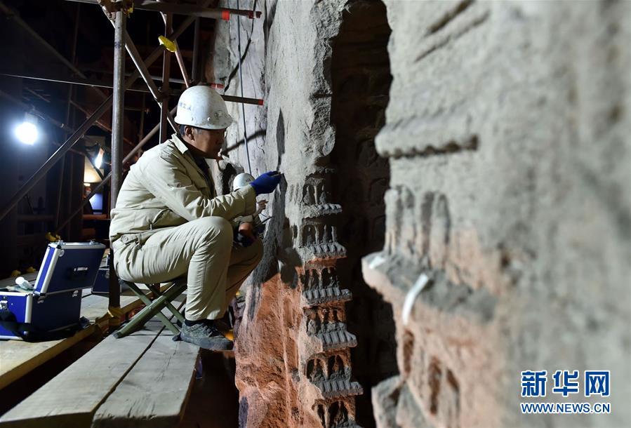 5月10日,在山西省大同市,工作人员对云冈石窟进行维护保养。新华社记者 武敌 摄