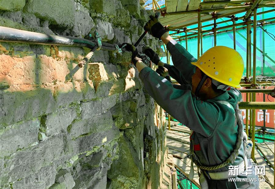 5月11日,工人对内蒙古赤峰市敖汉旗辽代武安州白塔塔身进行临时性加固。 新华社记者 王靖 摄