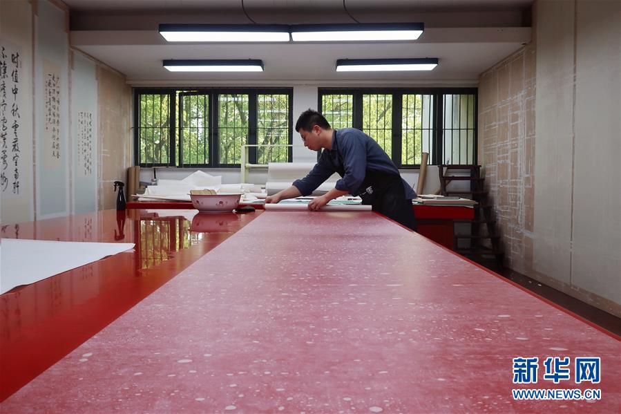 5月13日,古籍修复师在对书画作品进行装裱操作。 天一阁藏品修复部目前有修复师14人,每年约修复古籍14000余页。据介绍,修复一册古籍通常需要1至2个月,有的甚至需要1年以上。 新华社记者 郑梦雨 摄