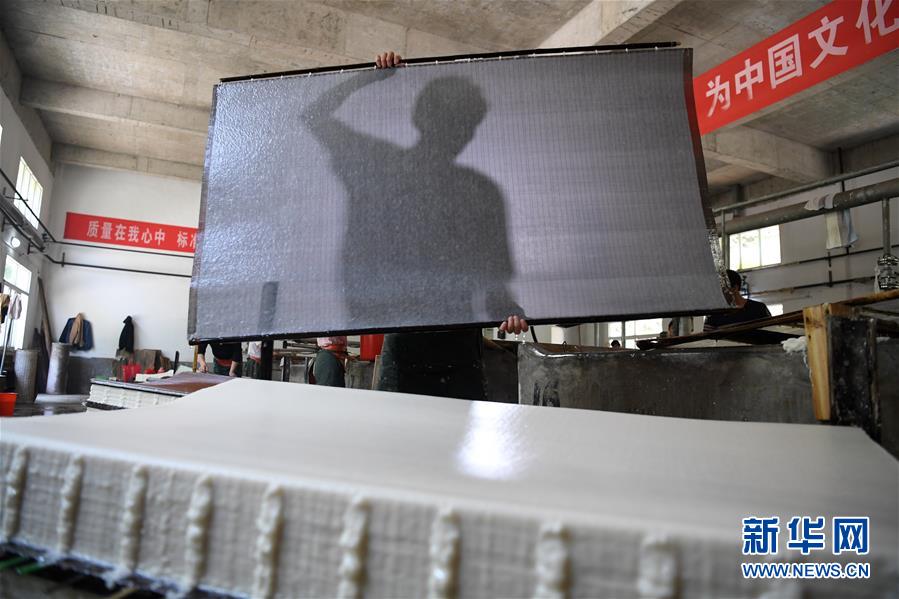 5月11日,安徽省泾县宣纸厂工人在进行捞纸作业。新华社记者 张端 摄