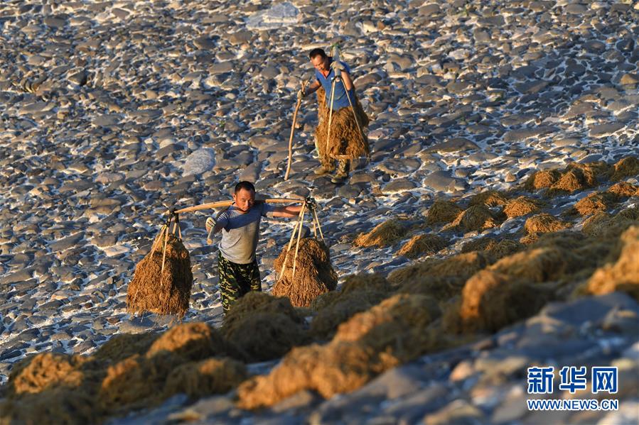 5月12日清晨,安徽省泾县宣纸厂工人肩挑宣纸制作原料——稻草、檀皮,运到山坡准备摊晒。新华社记者 韩晓雨 摄