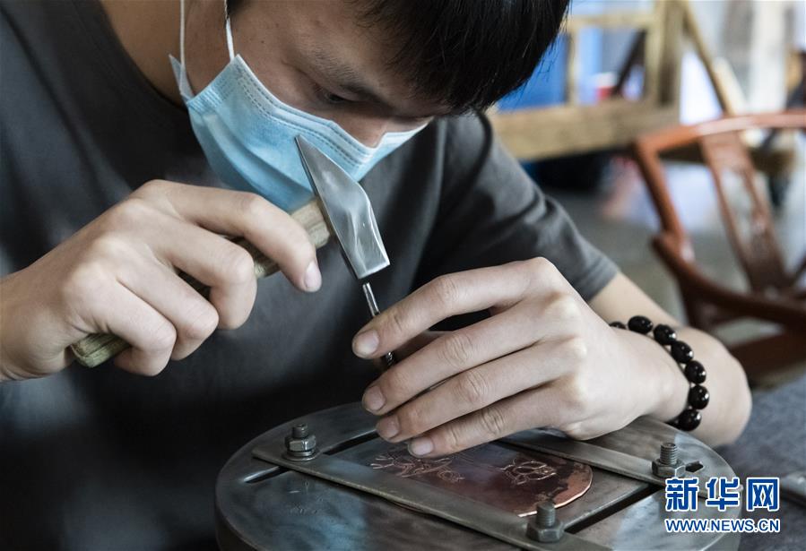 5月18日,在云南民族博物馆乌铜走银制作体验现场,一名非遗传承人演示如何錾刻图案。 当日是国际博物馆日,云南民族博物馆举办“滇之瑰宝——乌铜走银精品展”。此次展览以126件(套)乌铜走银精品展示为主线,以工艺制作和活动体验为辅线,结合讲解、播放影视资料、现场制作体验等,展现乌铜走银制作工艺和艺术价值。 新华社发(陈欣波 摄)