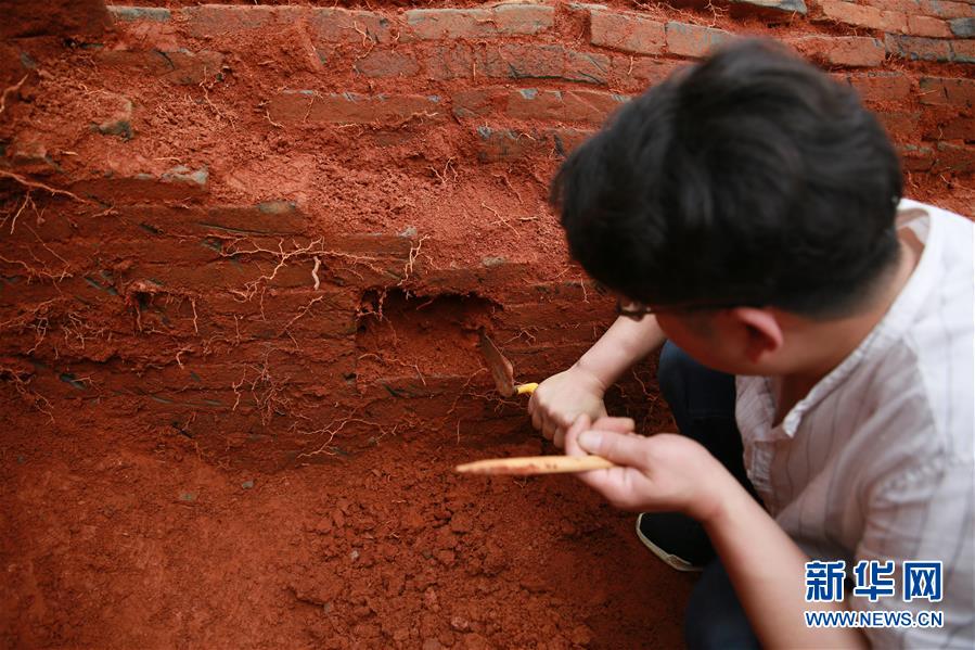 在湖南省宁乡市坝塘镇南芬塘村杨家湾,考古人员正在发掘一座宋代夫妻合葬墓,两个墓室之间有一扇小窗,俗称“过仙桥”,表达了古人希望来世再续姻缘的美好愿望(5月17日摄)。 记者19日从湖南省文物考古研究所获悉,考古人员对湖南宁乡市坝塘镇南芬塘村杨家湾古墓群进行抢救性发掘,发现一座东汉墓葬和一座北宋夫妻合葬墓。其中,北宋夫妻合葬墓设有较为特殊的“过仙桥”。 新华社发(刘静 摄)