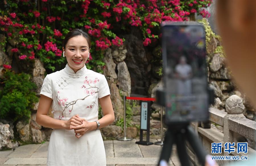 5月19日,讲解员缪妙在福州历史文化街区三坊七巷直播介绍古厝文化。 当日是中国旅游日,福州推出“云游坊巷”专题直播活动,让各地游客通过网络“云游”福州古厝和坊巷等。 新华社记者 林善传 摄