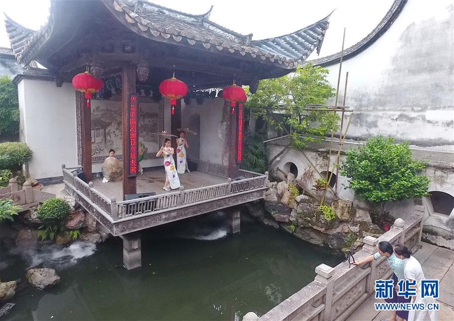 5月19日,工作人员在福州历史文化街区三坊七巷进行文艺表演直播(无人机照片)。 当日是中国旅游日,福州推出“云游坊巷”专题直播活动,让各地游客通过网络“云游”福州古厝和坊巷等。 新华社记者 林善传 摄