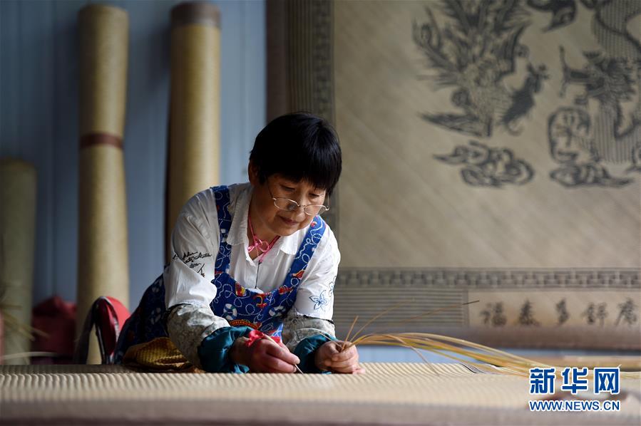 5月21日,工人在潜山市欣兴鑫舒席专业合作社对编织完成的舒席进行修整。新华社发(周牧摄)