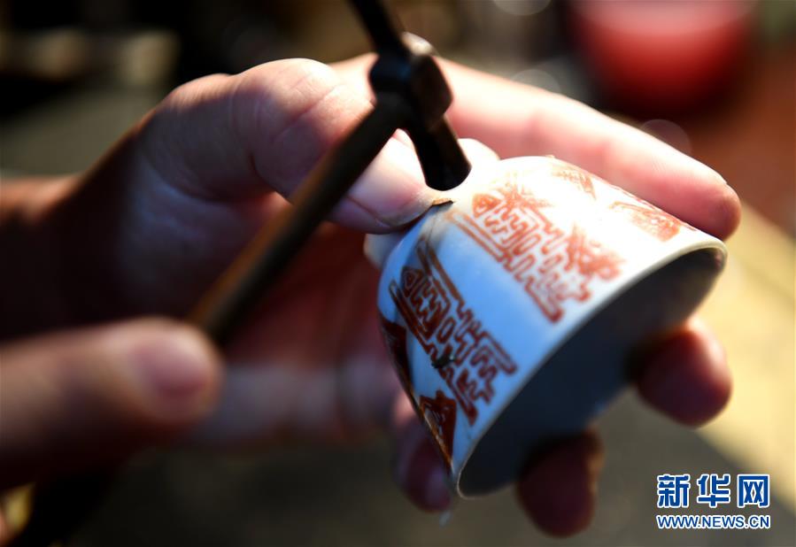 6月8日,在石家庄市桥西区工作室,李军航为残破瓷加固锔钉。新华社记者 王晓 摄