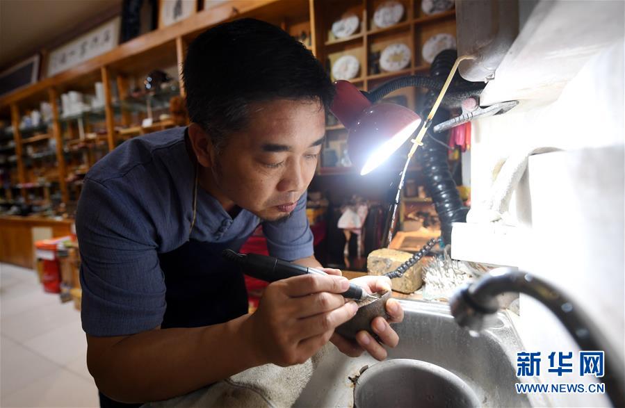 6月8日,在石家庄市桥西区工作室,李军航在清理破损的瓷器。新华社记者 王晓 摄