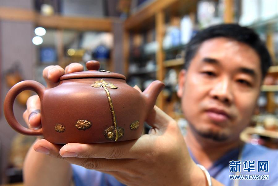 6月8日,在石家庄市桥西区工作室,李军航在展示锔刻好的瓷器。新华社记者 王晓 摄