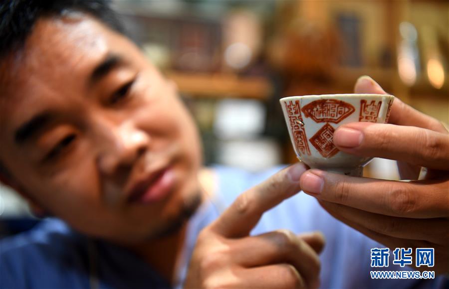 6月8日,在石家庄市桥西区工作室,李军航查看修复的瓷器。新华社记者 王晓 摄