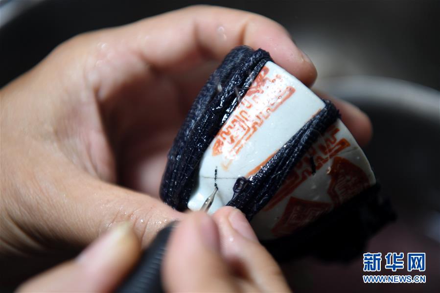 6月8日,在石家庄市桥西区工作室,李军航用金刚钻为残破瓷器打孔。新华社记者 王晓 摄