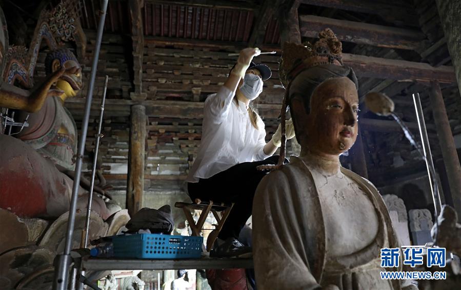 6月8日,工作人员对奉国寺的彩绘泥塑进行保护修复。