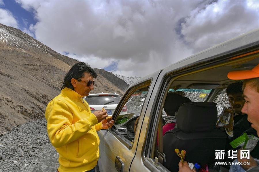 去往达布达尔乡热斯喀木村途中,塔县文工团演员在吃干粮(6月5日摄)。新华社记者 胡虎虎 摄