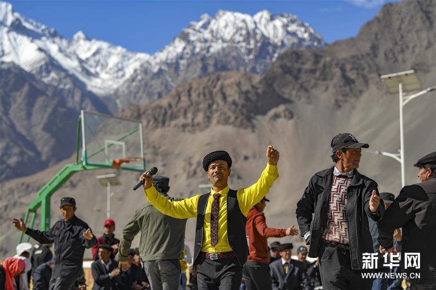 在热斯喀木村,新疆塔什库尔干塔吉克自治县文工团演员阿布都热苏力·曼苏尔汗(身着黄色衬衣者)为村民演唱民歌《我爱你,祖国》(6月6日摄)。新华社记者 胡虎虎 摄