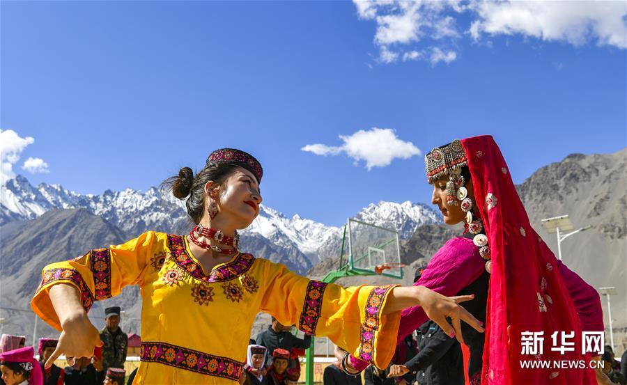 在热斯喀木村,新疆塔什库尔干塔吉克自治县文工团演员(左)与村民一起跳舞(6月6日摄)。新华社记者 胡虎虎 摄
