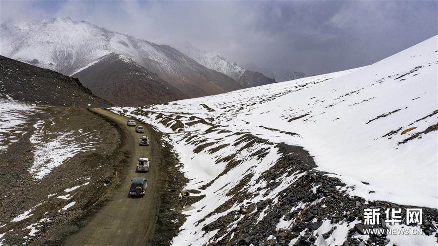 新疆塔什库尔干塔吉克自治县文工团演员开车翻越雪山达坂,前往达布达尔乡热斯喀木村演出(6月5日摄,无人机照片)。新华社记者 胡虎虎 摄