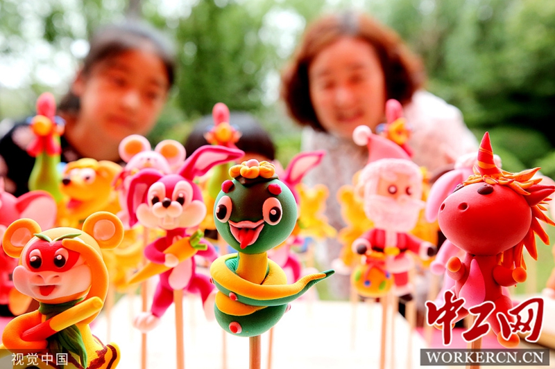 2020年6月10日,山东枣庄东湖公园内,市民在观看不同样式的面塑作品。图片来源:孙中喆/视觉中国