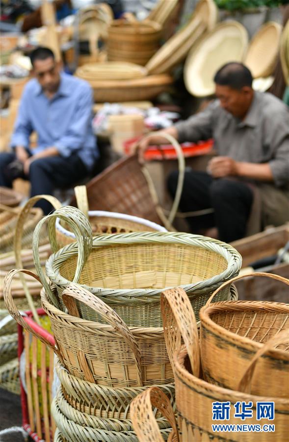 6月11日,在湖北省宣恩县城民族路,篾匠黄明(右)在为一市民维修竹背篓。 湖北省宣恩县是土家族、苗族、侗族等少数民族聚居区,竹制的背篓、箩筐、簸箕等用品与群众生产生活息息相关。人们或购买篾匠们精心编织的“篾货(当地人对竹篾制品的统称)”,或花上三五元钱对“篾货”进行修理后继续使用。在宣恩县,传承着湖北省非物质文化遗产“宣恩竹编”技艺的手艺人,用灵巧的双手为当地居民提供服务,满足百姓订做、维修竹篾制品的需要,成为当地一道独特的风景。 新华社发(宋文 摄)