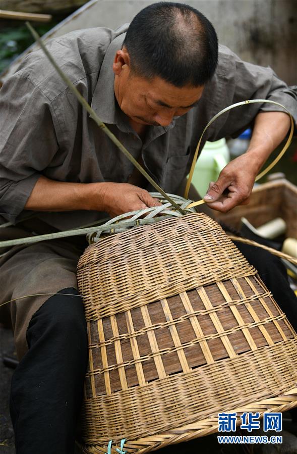 6月11日,在湖北省宣恩县城民族路,篾匠黄明在重新编织一破损背篓的背篓底。 湖北省宣恩县是土家族、苗族、侗族等少数民族聚居区,竹制的背篓、箩筐、簸箕等用品与群众生产生活息息相关。人们或购买篾匠们精心编织的“篾货(当地人对竹篾制品的统称)”,或花上三五元钱对“篾货”进行修理后继续使用。在宣恩县,传承着湖北省非物质文化遗产“宣恩竹编”技艺的手艺人,用灵巧的双手为当地居民提供服务,满足百姓订做、维修竹篾制品的需要,成为当地一道独特的风景。 新华社发(宋文 摄)